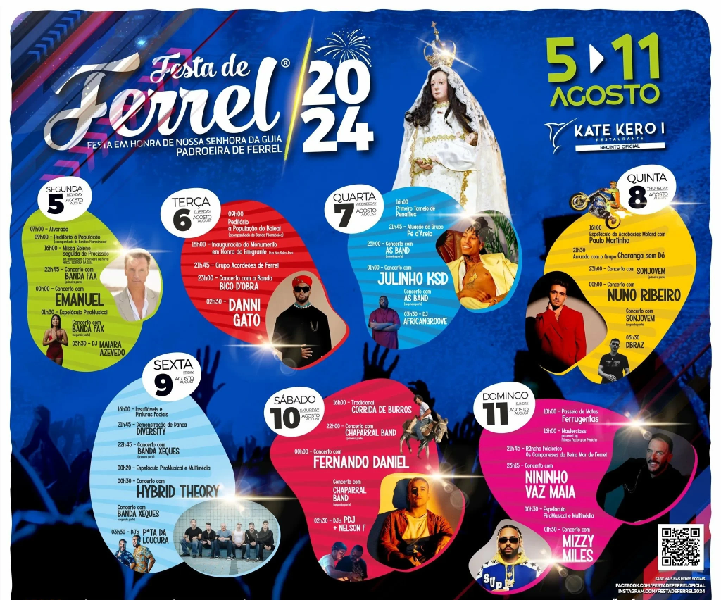 A festa de Ferrel, em honra de Nossa Senhora da Guia, terá início na segunda-feira, dia 5 de agosto, e prolongar-se até domingo, dia 11 de agosto.