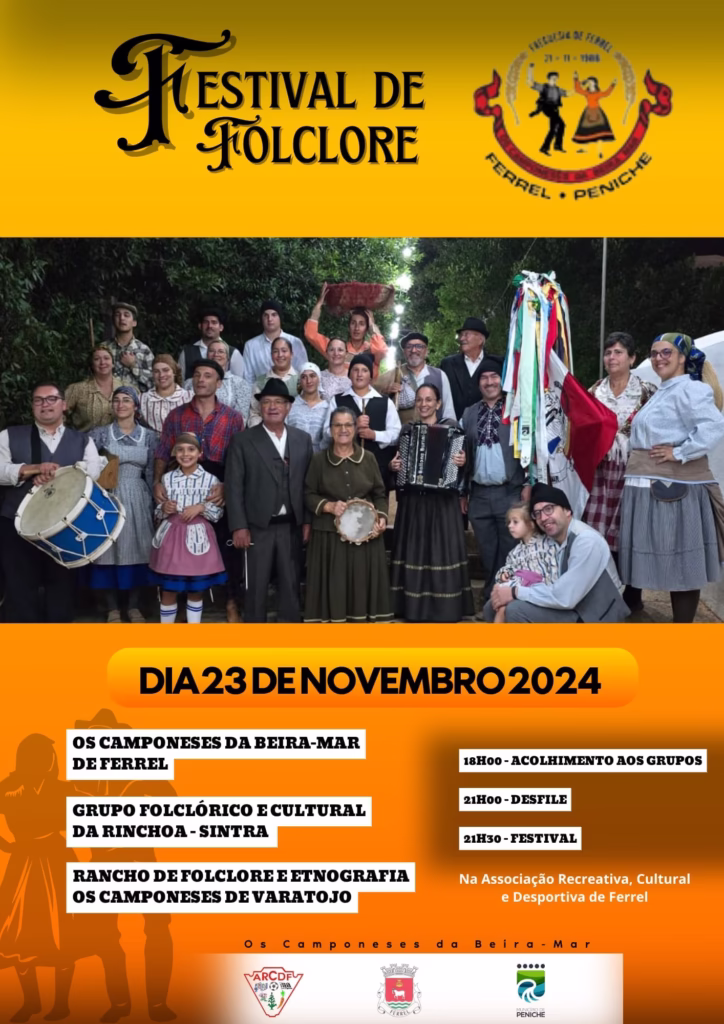 O festival contará com a participação de três grupos folclore: o grupo anfitrião, “Os Camponeses da Beira-Mar”, de Ferrel, o Grupo Folclórico e Cultural da Rinchoa, de Sintra e o Rancho de Folclore e Etnografia “Os Camponeses de Varatojo”, de Torres Vedras. O programa terá início às 18 horas, com a receção dos grupos convidados, seguida de um desfile às 21 horas. A apresentação do festival será às 21h30.