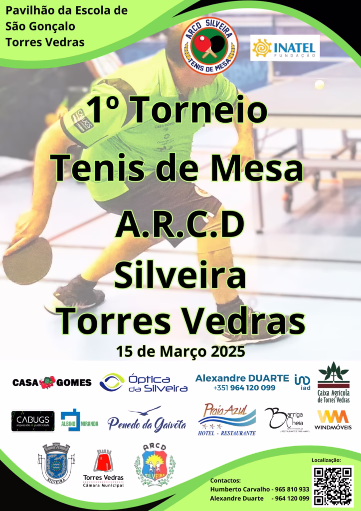 No próximo dia 15 de março, o Pavilhão da Escola São Gonçalo, em Torres Vedras, será palco do 1.º Torneio de Ténis de Mesa da Associação Recreativa, Cultural e Desportiva (ARCD) da Silveira.